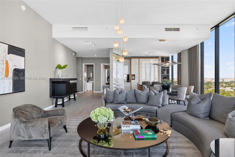 Positioned on a premier penthouse level, this residence showcases sweeping views of Biscayne Bay from its spacious, elegantly designed interiors. Striking 12-foot ceilings and light-filled living areas are enhanced by custom furnishings by Artefacto. A private elevator opens into a dedicated foyer leading to 3 beautifully appointed bedrooms and 3.5 baths. Park Grove is set on five acres of lushly landscaped grounds, featuring 50,000 SF of resort-style amenities. Residents enjoy multiple pools, a full-service spa, state-of-the-art fitness facilities, business lounge, theatre, outdoor gardens, pool side bistro, and close proximity to marinas. This exceptional development combines elevated architecture, unparalleled amenities, and a prime waterfront location in the heart of Coconut Grove.