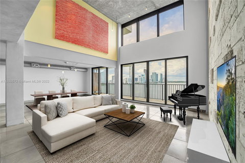Open water views from the moment you enter! Spacious loft style penthouse duplex in boutique building with 3 bedrooms PLUS den/Media room, and 3.5 baths. First floor has open living/dining with 18ft ceilings, guest suite with ensuite bath and separate laundry room. Second floor has master suite, guest bedroom and den/media room. Polished concrete floors and ceilings througout. Unit comes with 1 assigned parking spot plus addl parking for extra car and guests. Amenities include bay front pool, tennis court, day dock, party room, storage for paddle boards and new gym in the final stages of construction. Easy access to South Beach, DT Miami, Wynwood and Design District.