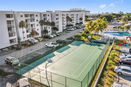 The unit features views of the garden and pool area. Each unit may include modern kitchens, high ceilings, and ample closet space. Custom touches like tiled floors and private balconies enhance the appeal. Two assigned parking spaces come with each unit, contributing to daily convenience.