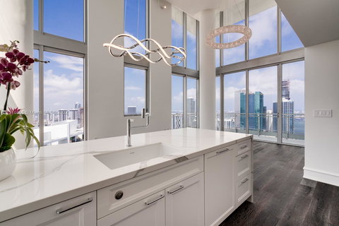 Re-priced at APPRAISED value! Jaw-dropping, fully customized & BRAND NEW PH @ Mint: No detail has been overlooked in this top floor 3 bed w/double-height ceilings & 3 view exposures - 270+ degrees of ever-changing skyline, water, and sunset + sunrise views. Hardwood floors, electronic retracting light fixtures, imported cabinetry w/integrated Bosch & Miele appliances, Franke kitchen fixtures, calcutta book-matched marble bath, designer bath vanities and fixtures, designer baseboards, linear diffusers throughout, 2 dual-cycle Miele washer/dryers, LG Steam Closet, custom doors & hardware, multi-color LED lighting. New Bosch AC system, new plumbing. XL storage room inside unit. 26 impact windows in living area for ultimate entertaining. Waterfront, gated complex; quick walk into Brickell.