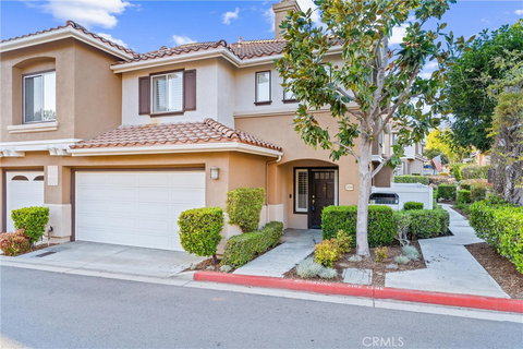 Welcome home to this beautifully updated corner property with 2 car direct access garage. The home has soaring ceilings, a fireplace in the living room, undated kitchen with cherry wood cabinets and granite counters with newer stainless-steel appliances, walnut engineered hardwood floors downstairs and brand-new carpeting upstairs. The primary suite upstairs has crown moldings', custom cabinets and a ceiling fan. The second bedroom is also spacious, with crown moldings and a large window. The flex room upstairs can easily be converted to a third bedroom. It has custom cabinets with soft close drawers, custom bookshelves and a clear view of Santiago peak, perfect for a home office. Brand new central HVAC system. There is a 2 car attached garage with direct entry that has custom cabinets, new polyaspartic floors w/ moisture barrier and Tesla wall connector. This corner unit is located next to a newly renovated community swimming pool and children's play area. There is ample guest parking throughout. Enjoy Lake Mission Viejo access throughout the year where there are summer concerts, boating and lagoons. Upscale refrigerator, washer and dryer are also included. Easy access to shopping, entertainment and transportation. Low HOA dues. Beautiful landscaping throughout. This home is truly a pride of ownership property.