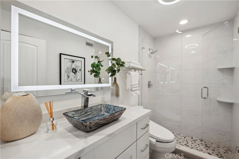 Step into contemporary elegance as you enter this beautifully renovated 2-bedroom, 2-bathroom upper unit condo located in Las Palmas in Mission Viejo. Featuring modern tile flooring throughout, this home exudes sophistication and style. The spacious, open floor plan is bathed in natural light, thanks to a large sliding glass door that leads to a private balcony—ideal for both indoor and outdoor entertaining. The heart of the home boasts a chef's dream kitchen with a striking waterfall island, sleek stainless-steel appliances, and recessed lighting that highlights every detail. Retreat to the luxurious dual primary suites, complete with mirrored closet doors, recessed lighting, and ensuite bathrooms. Each bathroom is a haven of relaxation with gray tile flooring, quartz slab countertops, one with a custom tile walk-in shower and the other with a tub/shower combo, built-in speakers, mirrors with LED lighting, and bidet toilets. This condo seamlessly blends modern comfort with thoughtful design, making it a perfect place to call home.