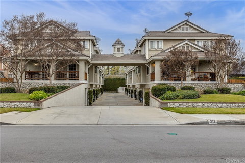 This beautiful multi-gabled tri-level townhouse built in 1992 offers condo living at its finest. Inside the front door, the warm living room invites you in with gorgeous laminate flooring, bay window with plantation shutters, an open floor plan, crown moulding, recessed lighting and a sweeping staircase to the upper level. The kitchen offers a dining area and breakfast bar, along with ample mahogany wood cabinetry, quartz countertops, stainless steel double sink, stone tile flooring, and a stainless five-burner gas range and hood. Upstairs are two en-suite bedrooms with Berber carpet, ceiling fans, large closets and attached bathrooms. On the lower level is a laundry area with custom cabinetry, and direct access to the two-car attached garage. Generous storage throughout. Other amenities include a gated front patio, central air & heat, low HOA dues, green space, and a dog run. Close to the Gold Line, shopping, freeways, and ready to move right in!