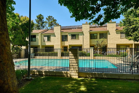 Beautifully updated two level 3 bedroom townhouse in much sought after Stanton Place Association, very close to Google, with great schools, tucked in the quiet back end of the complex, overlooking the sparkling pool. The downstairs living room has a fireplace and modern entertainment center, waiting for your oversized T.V., books, games, decorations. The kitchen opens up to a spacious air conditioned family room/dining room combination, with sliding glass doors leading out to a fenced in patio, which could be a great garden. Through the patio is an extra large garage, with lots of storage space. Upstairs are 3 bedrooms, all very light and bright with vaulted ceilings. The Master bedroom is especially generously sized, with a separate sitting area that includes a separate designer closet system, perfect for your Organized Fashionista! Brand new carpets just added!