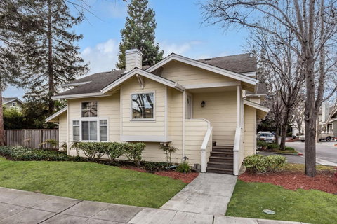 Tastefully remodeled townhome end unit that feels like a single family home with a large backyard. Enter the formal entry & view the large & inviting living room with dramatic high ceilings, tiled fireplace & built-in bookshelves. Separate dining room with French doors to the private, fenced backyard with new lawn & mature trees, ideal for outdoor entertaining. Open eat-in kitchen with breakfast bar, Shaker style cabinets, Quartz countertop, stainless appliances & recessed lighting. Huge primary bedroom suite w/ high ceilings, walk-in closet, nook (ideal for home office) & windows with views. Spa-like bathroom suite with separate soaking tub, tiled shower stall & double vanity with Shaker cabinets & quartz countertop. Wonderful natural lighting throughout. Generous size junior bedrooms with ample closet space. Enviable, 2 car attached garage with roll up doors & additional storage nook, perfect for bikes & athletic gear. Hardwood floors throughout + central AC. A home for easy living.