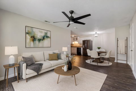 Top-floor unit with a recently renovated bathroom and a peaceful grassy view away from the street. Open floorplan, LV flooring, an updated kitchen with granite counters, a newly renovated bathroom, featuring new flooring, paint, and a new vanity. Washer/dryer remain. The second bedroom is perfect for a roommate, guest space, or home office. HOA covers water. Excellent investment property or first home — all within walking distance to shopping and restaurants!