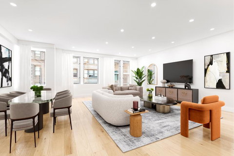 Unit 4, an elegant, 3 bedroom, 3 bathroom full-floor loft-like apartment, is beautifully outfitted with top-of-the-line appliances and features. This home offers impressive indoor and outdoor space that is unmatched, on one of the most accessible blocks in Chelsea. With high-end features including 6-inch European oak wood flooring by Hudson, oversized custom fitted closets and a dreamy Chef's Kitchen, this space is as grand as it is luxurious.Take the keyed elevator up directly to the fourth floor into the expansive space and welcoming foyer. To your right you'll find the dramatic living area, which offers ample light from oversized windows, and a gracious space large enough for a formal dining area and breakfast nook. The Poggenpohl Chef's Kitchen features voluminous cabinetry, white marble countertops, a breakfast bar, as well as a premium appliance package including a Sub-Zero Refrigerator and wine cooler, and four-burner Viking oven and stove.On the opposite side of the apartment, the primary bedroom continues to deliver this big, open and spacious feeling including significant closet storage, a south-facing terrace, and 5-fixture en-suite bath with soaking tub and glass-enclosed shower. The over-sized second bedroom also features a south-facing terrace and en-suite bath. The generously proportioned third bedroom features more storage space as well as its own full bathroom. Conveniently, there is a full-sized washer and dryer located in this part of the apartment. This home also features central air, LED custom lighting, and a huge basement storage room with shelving that is included with the sale (every New Yorker's in-building storage dream).The Paradigm is a 12-unit condo building located on one of Chelsea's most convenient blocks, and offers many modern amenities for its residents such as fob entry, video intercom system, key-locked elevator, and common roof deck.The location is unbeatable, just a few blocks from Madison Square Park, NoMad and Flatiron, all nearby. This ideal location has some of Downtown Manhattan's best eateries, shopping, and entertainment, with various boutique gyms in the immediate area including Barry's and F45 Training. The 1, M, RW subway stations are in close proximity for added travel convenience.
