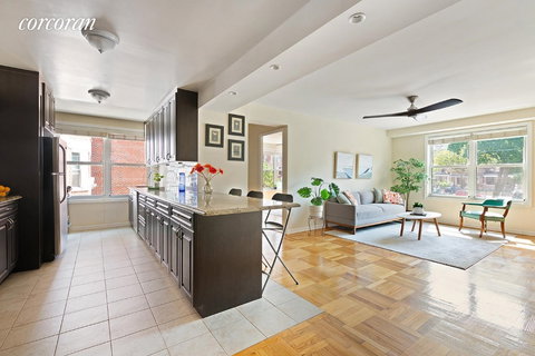 Welcome to 170 72nd street, Apt 527/528! This sprawling, 4bed/2bath, light-filled corner unit is located on the third floor of an elevator building, offering treetop views with Southern, Eastern and Western exposures. It features a spacious floor plan, two new bay windows, original hardwood and herringbone floors, and abundant sunlight and open space. Upon entry to the foyer, you are welcomed by a sun-drenched living/dining room with brand new over-sized windows and a layout that flows seamlessly into an open kitchen beaming with natural light. The extra-large, renovated kitchen features granite counter-tops, stainless-steel appliances, a Bosch dishwasher, custom flooring, and abundant cabinets & counter space, including a breakfast bar that seats four. The unit is thoughtfully laid out separating the sleeping area in the western wing of the apartment with three spacious bedrooms and a full bathroom. A large fourth bedroom with a new bay window is next to a second full bathroom. This 4th bedroom could be used as a home office, recreation room, or home gym. Additional features include all new windows throughout, plentiful closets, and concrete subfloors to decrease noise. Please note that all real estate taxes and utilities including ELECTRICITY are included in your maintenance and the owners are pre-paying the assessment due to expire in July 2023. Finally, this combined unit can be converted back to two one-bedroom apartments if desired. Building amenities include two laundry rooms, storage, parking (short wait list), a live-in super, and a landscaped courtyard. The building is pet friendly and allows unlimited subletting after 2 years of ownership. It is located across the street from the local public library, close to 3rd Avenue's shops & restaurants, and a short distance from the Shore Road Promenade and waterfront parks. There is also easy access to transportation with the R subway, X27/X37 express buses and NYC commuter ferry to Manhattan and Downtown Brooklyn. This apartment is a must-see! Call/email the LISTING AGENT today to schedule your showing.