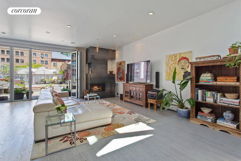 Nowhere like it in Brooklyn! With a private entrance at 433 13th Street, this unique Park Slope 4 bedroom, 2 bath loft is part of the coveted Ansonia Muse condos on 12th Street. Come home to your own separate entrance and enjoy amenities that are so rare in NYC like a garage parking space (available for purchase) with ample bike storage and an amazing private roof deck/garden.Pull into your indoor parking spot and enter this one-of-a-kind home through a foyer with two large closets and stairs leading up to the impeccably designed living quarters. The incredible open feel awes you as you encounter the wonderful floor-to-ceiling glass wall bathing the great room with sunlight. This spacious living room with large dining area, custom wood burning fireplace and surround sound, overlooks your 2200 square foot outdoor oasis and is ideal for entertaining. The folding glass wall allows for seamless indoor/outdoor living as you enjoy the enormous patio and garden with irrigation and landscape lighting, a full outdoor kitchen, 6-person hot tub and custom bocce court. Skylights with remote-controlled venting further brighten the living area. The beautiful open gourmet kitchen with granite countertops and stainless-steel appliances has an abundance of cabinets and plenty of counter space. A wide, airy hallway leads to the three generously sized bedrooms. The master suite boasts a luxurious sky-lit bath, two large closets and its own glass wall with direct access to the deck. The fourth room is currently used as a home office and could easily convert to a nursery or bedroom. Storage is plentiful with California Closets found throughout, a linen closet, and a separate laundry room. Other highlights include oak floors, remote-controlled sun and blackout shades, central air and a security system.Life is even more complete with a condo courtyard, superintendent, and concierge for packages. Just a few blocks from the F and G trains, 2 blocks from Prospect Park and around the corner from several Citibike stations and all that 7th Avenue has to offer.
