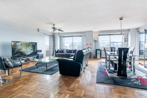 MILLION DOLLAR VIEWS, ABUNDANCE OF LIGHT, ABUNDANCE OF SPACE; UNOBSTRUCED DOWNTOWN AND UPTOWN VIEWS, RIVER VIEWS, BREATHTAKING OUTDOOR SPACES, (2 BALCONIES) – All describe this ONE- OF – A - KIND apartment. Welcome home to this combination apartment facing South, West and North. Enjoy colorful sunsets while you relax with a glass of wine on your choice of balconies (2) facing west and north. You enter the apartment into a foyer that unfolds into both the grand living room and dining room. The main living space is an expansive open area (24 x 19) accommodating both living and dining on a grand scale. The well designed eat in kitchen can easily accommodate several cooks preparing a spectacular meal together. The king sized master bedroom with Sunset Views is a quiet haven. The windowed baths are flooded with sunlight and views. Low maintenance, hardwood floors and tons of storage complete this package. Make your dream come true with this apartment!