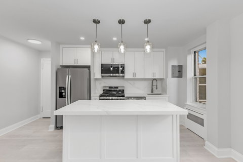 Sponsor Apartment. No Board Approval. Step into this inviting 1 bed, 1 bath apartment where comfort meets convenience. The recently renovated kitchen boasts quartz countertops and a matching backsplash, complemented by new stainless steel appliances. The kitchen seamlessly flows into the open-concept living/dining room, creating a spacious and welcoming atmosphere for entertaining or relaxing. The spacious kitchen island offers plenty of storage with USB outlets. Throughout the apartment, you'll find refinished hardwood floors adding warmth to the space, illuminated by recessed lighting that creates a cozy ambiance. The fully renovated bathroom is a sanctuary of style, featuring a walk-in shower with sliding glass doors that showcase beautiful mosaic tile floors, adding a touch of elegance to the space. You'll appreciate that the vanity as well as all the window sills in the apartment have the same matching quartz from the kitchen, adding an overall cohesive touch. With windows facing both North & west, this apartment is filled with natural light throughout the day, further enhancing its inviting atmosphere. Located near two major train stations, as well as plenty of restaurants, shops, and a new Trader Joe's just 5 minutes away, this apartment offers both comfort and convenience. Schedule a viewing today and imagine yourself calling this cozy apartment home! Those with furry companions will be happy to know that this building is pet friendly.