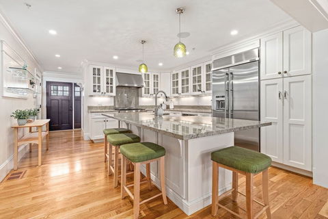 As you walk into the foyer you will be in awe of the many added upgrades. The Foyer has a 1/2 bath, Closet, Built-In Desk and access to the Garage. The open concept w/Gourmet Kitchen boasts Custom Wood Cabinets, SS appliances including a 36" 6-burner gas range stove, and a large granite countertop island with enough seating for 5. The open living/dining room boasts a fireplace, and custom cabinetry.The private, outdoor stone patio is ideal for grilling or morning coffee. The 2nd floor offers 3 bedrooms, a Full Luxury Bathroom, Laundry Room and a master suite with a beautiful marble bath, a large walk-in closet, and a balcony. The 3rd floor is an Ideal Retreat for a guest room/office/sitting room with a Full bathroom. Finished Basement offers additional recreation space with an additional Full Bathroom, Built-In Cabinet w/Beverage Cooler & Wine Cooler, and included 85" Flat Screen TV. Great Schools, Restaurants, Movie Theater and Transportation. OFFERS DUE BY Monday, 4/12 @ 6:00.......