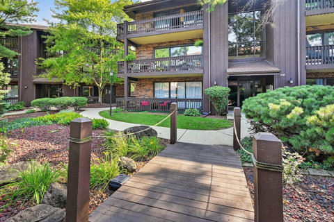 Experience luxury and comfort in this exquisitely renovated condo, nestled in a desirable flex iCore building within The Pines community. Enjoy the convenience of nearby shopping, dining, and entertainment options, along with easy access to public transportation. Completely updated in 2025 modern 2 bedrooms 2 bathrooms condo on a quiet street. New water and scratch resistant wide plank luxury laminate floors thorough the whole condominium. Open floor living space is designed for modern living and entertaining. The heart of the home is the beautifully appointed kitchen, showcasing brand-new stainless-steel appliances, soft closing shaker cabinets and sparkling quartz countertops. Step into the master bedroom, where you'll find a private sanctuary featuring a full en-suite bathroom and a spacious walk-in closet with ample shelving. Enjoy year-round comfort with zoned heating and air conditioning, complemented by extra insulation that helps keep utility bills low. The expansive 20-foot balcony has a serene view of the courtyard and surrounding pine trees. This condo is a quiet haven that balances style, functionality, and peaceful living. First floor living makes it easily accessible. It comes with 1 garage space and 1 assigned parking space right near back entrance. Washer and dryer in the unit.