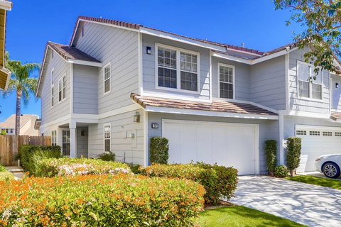 Beautiful end unit Townhome located in the peaceful tract of Vista Santiago and overlooking the community pool and spa. The flooring and paint is approximately one year old and this move in ready home features three spacious bedrooms with vaulted ceilings, 2.5 bathrooms and only one shared wall. Light and spacious living room with cathedral ceiling and cozy gas fireplace, primary bedroom with large bathroom with dual vanities and walk in closet, two car garage with direct access, recessed lighting, central heat and air conditioning and more! Slider doors from the living room and kitchen open onto a private patio just steps from the community pool and spa. Walking distance from Grijalva Park, Santiago Creek Trail and Bike path and conveniently close to local schools, shopping and dining. HOA features a sparkling pool and spa and lovely greenbelt. Come see your new home today!