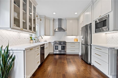 This stunning turnkey home is located in the beautiful hills of Orange and is sure to capture your heart from the moment you step inside. As you enter, you'll be welcomed by a light and airy floor plan with vaulted ceilings and gorgeous engineered hardwood floors in a "Bungalow Maple" finish. The custom and recessed lighting fixtures add an elegant touch to the space, making it feel warm and inviting.