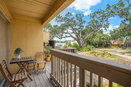 The architectural design includes wood beams and a cozy wood-burning fireplace. Many units have Jack and Jill bathrooms and laminate floors, making them both inviting and functional. The building is surrounded by greenery, with views of trees and water.