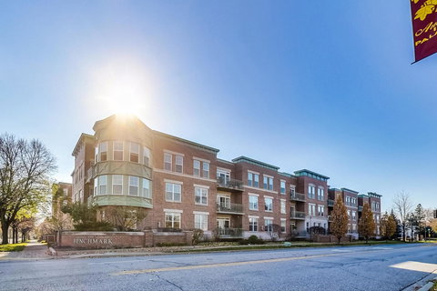Great Location in downtown Palatine, this 3 Bedroom and 2 Full Bathroom end unit Condo is all ready for you! The Waterford model offers 1,862 square footage of perfectly planned living space & walk out balcony. Elevator from secured foyer takes you to 2nd floor and unit is at the end of quiet hallway offering privacy. Welcoming Foyer opens to highlight the newly install, rich hardwood floors! Leading to the Bright and expansive living room centered around your gas fireplace is perfect for those cool evenings. Sliding Glass Door opens to a private balcony with pretty views overlooking trees and fountain. Newly Installed on Balcony is a custom awning usable in the summer months. In Addition, the Primary Bedroom and Bedroom 2 also have Newly Installed Awnings that are used during the summer. Dining Room features a decorator chandelier and is big enough to host large dinner parties. Kitchen is finished in timeless wood cabinetry providing amazing storage, under cabinet lighting, pantry cabinet, new quartz countertops & island with breakfast bar seating for quick bites & updated appliances. Primary Suite enjoys a large walk in closet filled with organizers, private full bathroom complete with dual sinks, separate glass enclosed shower & jetted tub for ultimate relaxation. 2nd bedroom has built in shelving/cabinetry and walk in closet with more organizers! The 3rd bedroom is located off main living area and can double as your home office. Full hallway Bathroom with tile tub/shower surround. In unit laundry room includes more cabinetry and space for storage! This condo includes 2 secured garage spots (13 & 14) and 2 storage units for any extras. Wonderful location with easy access to grocery, great restaurants, retail, entertainment and Metra Station! Home is served by Wm. Fremd High School.