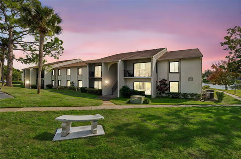 One or more photo(s) has been virtually staged. Welcome to Pine Ridge at Palm Harbor, a desirable 55+ community offering maintenance free Florida living in this beautifully updated First Floor two bedroom two bath condo. The bright living area features double pane sliding glass doors that open to a covered and screened patio, creating a comfortable space for relaxing or entertaining. The open concept floor plan flows seamlessly into the updated kitchen, which includes cherry wood cabinetry, travertine backsplash, under mount LED lighting and granite countertops, along with newer appliances including a dishwasher installed March 2025 and a range, refrigerator and microwave from 2019. An inside laundry room with shelving includes a full size washer from 2019 and dryer for added convenience.