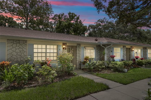 VA APPROVED!! MOTIVATED SELLER!!! SELLER IS BUYER-BROKER FRIENDLY IF WRITTEN IN AN OFFER! Welcome to your dream golf community lifestyle at Highland Lakes! This stunningly updated two-bedroom, two-bath villa-style condo offers a luxurious living experience. Step inside to find beautiful tile flooring throughout, complemented by gleaming granite countertops and solid wood cabinetry in the kitchen. Stainless steel appliances add a modern touch, while an abundance of natural light fills the space, creating an inviting atmosphere. Enjoy the Florida sunshine from the comfort of your rear patio providing a relaxing space to enjoy the outdoors. Extra features abound, including custom barn doors, skylights, modern lighting fixtures and ceiling fans for added comfort. Convenience meets style with an inside laundry room and spacious bedrooms providing ample storage and living space. Rest easy knowing your home is equipped with a brand new roof and updated electrical panel for peace of mind. With an open split bedroom floorplan, this condo offers both privacy and functionality, perfect for everyday living or hosting guests. An excerpt from the Homeowners Association website quotes, "Highland Lakes offers its members extensive sun-and-fun fitness opportunities: Besides unlimited free golf on our 27-hole executive golf course, residents enjoy the use of tennis, pickleball, bocce, and shuffle board courts and an Olympic size geothermal heated pool and spa. For a slower pace, enjoy an extensive lending library, cards and games, billiards, arts and crafts, ceramics and woodworking. Or consider a leisurely exploration of Lake Tarpon, with a lunch stop at a local lakeside restaurant, on one of our two pontoon boats docked at our rustic lakeside lodge. All of these are available for members' use any time with no additional charge". HOA fee covers water, sewer, trash, cable, internet, grounds maintenance and building insurance which includes the roof! MAKE SURE TO CHECK OUT THE PROPERTY VIDEO AND 3D PROPERTY TOUR!