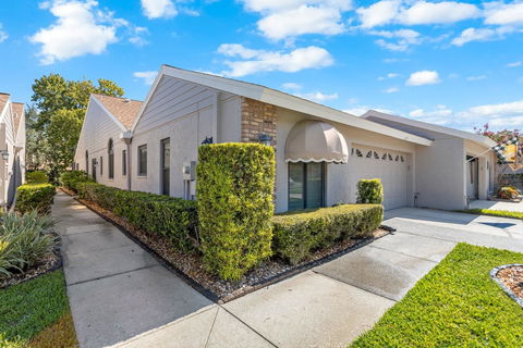 Under contract-accepting backup offers. Welcome to Salem Square…Palm Harbor’s best kept secret! If you are looking for location, value and great style with a no maintenance lifestyle, look no further! Salem Square is nestled in the quiet Ridgemoor neighborhood with great amenities like walking trails, tennis courts and a pool and playground to enjoy. This special villa provides 3 bedrooms or 2 + den, 2 beautiful baths, an interior laundry room, a 2 car garage, a beautiful yard and a lanai on the pond. Curb appeal abounds as you approach this villa, and once the front door opens, you are transported into a warm and welcoming atmosphere with soaring ceilings, pristine plank tile flooring, an open concept floor plan and a remodeled interior. Beautiful plantation shutters provide privacy on every window and sliding door, and storms are never an issue with the newer hurricane rated windows, sliders and garage door! You will appreciate entertaining large or small gatherings in the living area which is nicely sized and overlooks the screened lanai. The lovely lanai is the perfect place to enjoy a cocktail before dinner and serves as a refreshing respite as you enjoy views of the pond and nature. The dining room with its delightful atrium view is perfect for all meals and is large enough for a crowd or small enough for an intimate dinner, and is open to the living room and kitchen. The cook’s kitchen is a remodeled work of art with tons of wood cabinets which include soft close, pull out drawers, newer stainless appliances, endless quartz counters, a subway tile backsplash and a large island. A bank of extra cabinets completes the space! After a long day, retreat to the spacious owner’s bedroom suite which has its own entrance to the lanai to enjoy. A large walk in closet and lovely bath with double sinks, a warmer fan for chilly mornings, an enchanting vanity and a walk in shower finish the suite. The triple split bedroom plan provides privacy for family and guests. The 2nd bedroom can easily accommodate multiple family members comfortably, and is so convenient with the lovely bath just a few feet away! The 3rd bedroom doubles as a den/craft room/office with its built ins for convenience. Laundry day is a breeze in the interior laundry room, which also provides extra storage and a laundry sink. Your morning coffee or a cocktail after dinner can be an entertaining respite as you enjoy views of the pond and nature in the screened lanai. The A/C was replaced in 2021 and the roof is 2015. All this and a 2 car garage which is large enough for your cars and toys! If you are looking for resort style living in a secure, no maintenance community, close to TIA, world class golf, fine dining, and our famous Gulf beaches, welcome home!