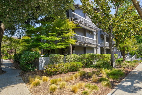 Rarely available Penthouse end-unit with creekside views, immense privacy and vaulted ceilings. Just 3 blocks from University Avenue, shops, restaurants this top floor location benefits from towering ceilings and abundant natural light. The gated courtyard entrance offers stairs or elevator access to a private outside entrance. Inside hardwood floors extend throughout the main living areas featuring a fireplace and sliding glass doors to the expansive balcony overlooking open space. The kitchen has been remodeled with cherry cabinetry, stainless steel appliances, granite counters and an expansive greenhouse window. Two large bedrooms with organized closet space and updated bathrooms. Adding extra convenience is the in-unit laundry plus gated garage parking for two cars. Unbeatable location for downtown living, yet with the tranquility of a creekside residential setting. Close to Stanford University, commute routes and downtown.