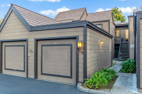 Top-floor Barron Square condo in a serene, tree-filled community. Spacious living room with vaulted ceilings, fireplace, wood floors, and a private balcony. Kitchen features stainless steel appliances and granite tile countertops, opening to a formal dining room with soaring ceilings and a large picture window. Expansive primary suite offers three closets and an en-suite bath with dual sinks and a quartz countertop. The guest bedroom shares access to a second balcony with afternoon sun. Oversized laundry room provides exceptional storage and may also function as a home office. Comfortable year-round living with central heating and air conditioning, along with a private one-car garage and an additional assigned parking space. Community amenities include a clubhouse, pool, indoor spa, sauna and tennis court. Located ideally close to parks, Stanford Nexus shopping and dining, and top Palo Alto schools.