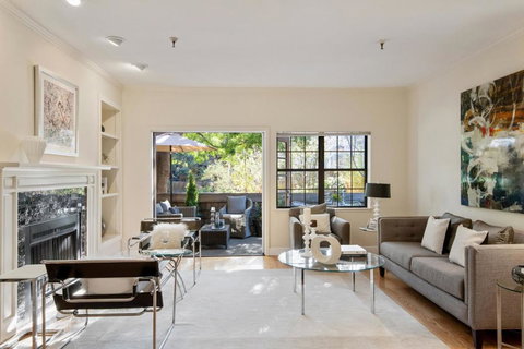 Rare combination of quiet serenity and amazing access to the best of Palo Alto. Quiet back corner unit with great light. Gleaming hardwood floors invite you to a spacious living/dining room with a marble fireplace, oversized window, and a french door opening to the back patio. Chefs kitchen boasts Viking and Bosch appliances, carrera countertops, shaker cabinets, and a butcher block island with a prep sink. Atrium style window bathes the bistro style dining area in beautiful light. The primary bedroom has a wall of windows overlooking the tree filled courtyard. The ensuite primary bath has marble countertops on a double sink vanity and a subway tiled walls. The two other bedrooms are served by an equally stylish hall bath. The back porch is wide enough for dining and lounging with friends. Secure and gated underground parking for two cars plus lockable storage closet. Outstanding walk score of 92 - minutes to shops, dining, schools, parks, train, Stanford. Excellent Palo Alto schools.