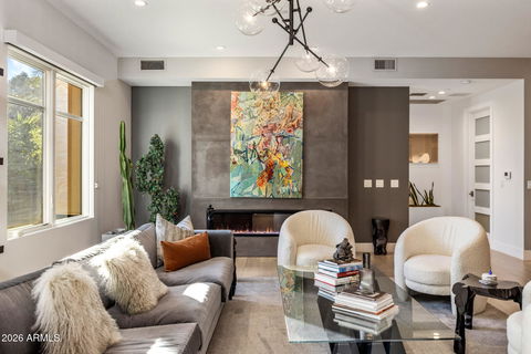 Luxury Living awaits at the exclusive Enclave at Borgata community, perfectly located in walking distance of the best Paradise Valley offers, and complemented by residents-only, resort-style amenities including a fitness center, pool, spa and dog park. Designed for an elevated lock-and-leave lifestyle with true indoor-outdoor ease, this stunning contemporary ground-floor residence offers an expansive open layout with premium finishes throughout. Bright, open-concept living is defined by a sophisticated neutral palette featuring wide-plank wood flooring and designer lighting. The chef's kitchen anchors the home with a dramatic statement backsplash, generous island seating, sleek cabinetry, 90-bottle wine chiller and premium Wolf & SubZero stainless appliances - perfect for effortless entertaining that flows from kitchen to dining to living. Walls of glass open to an expansive covered patio, complete with ceiling fan, lounge seating and a modern fire feature, all wrapped by a serene fenced yard that feels like a private courtyard. Thoughtful upgrades include a Creston smart-home system, enhanced soundproofing, custom closets and 4-person custom cedar sauna. Complete the experience with a private enclosed 4-car garage with Tesla charger, and enjoy convenient luxury living done right.