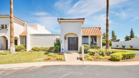 Luxury townhome in the heart of Scottsdale! Spacious 1884 s. f. single-level floorplan, 2 bed 2 bath + den, rare 2.5 car garage! Owners have made it easy for you, spending almost $50K since 2012, updating and improving! The great room is the heart of this home with a stunning beehive gas fireplace trimmed in tile, high ceilings with exposed wood beams, travertine floors throughout, and a generous wet bar perfect for your parties. The spacious master bedroom is your sanctuary with upgraded bathroom finishes, including a spa-like panel shower, a large walk-in custom closet and a new skylight. The upgraded kitchen has premium brand appliances,including a gas range and granite counters. Interior atrium was enclosed to a den/office (or a 3rd bedroom?) complete with two new skylights, and a double set of smoky-glass pocket doors for privacy. Your private patio is an oasis, complete with a fountain, heated spa and a natural gas BBQ, which conveys! Part of the patio was enclosed, adding a roof, skylights, lighting, and ceiling fans. Lots of storage space inside as well as out, with a separate storage building off the garage, and two walls of built-in cabinets inside the garage! Laundry room inside! LG w/d convey also! New flat roof 2013, warranty until 2023. Dishwasher replaced 2017. Newer gas hot water heater. Only steps away from the community pool, spa, gym and clubhouse! Be close to the finest restaurants, shopping and entertainment that Scottsdale offers! Come see today!