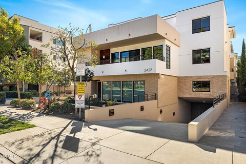 Sophisticated contemporary townhome style condo in the popular Del Mar Gardens! This upper level unit boasts an open concept floor plan that is the perfect place to spend each day. The first floor features an open concept layout: a modern chef's kitchen with bar seating, dining area, bar/pantry area with custom cabinetry and spacious living room extending to a covered balcony. A bedroom suite on this level is ideal for guests or those working from home in need of a private office. The stairway leading up to the second level hallway features high ceilings with windows for natural light. Two en suite bedrooms include a primary suite with sliding door that extends the living space to an amazing oversized balcony with treetop views. Additional features include: full bathrooms and custom closet systems in each bedroom, a powder room for guests, plentiful storage, in-unit laundry and two parking spaces in the gated subterranean garage. The community's common area offers a minimalist garden courtyard with lounge seating areas and an outdoor fireplace to enjoy. Blocks from Colorado Boulevard's markets, retail, dining and within close proximity to all that Pasadena has to offer!
