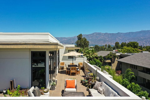 Perched atop Granite Park Place, Pasadena's premier concierge building, this luxury penthouse condominium boasts an open floorplan, 3 generous bedroom suites, & 875 sq feet of outdoor space w/ breathtaking views of the San Gabriel mountains & surrounding neighborhoods. This is a unique one-level 5th-floor penthouse on the prime Southeast corner of the South building facing out to the open expanse of the San Gabriel Valley. The recently renovated kitchen offers Ceasarstone counters, premium Viking appliances, & a large breakfast bar. The kitchen opens to a cozy family rm/den w/ custom designed built-ins. Adjacent to the family rm is the dining rm w/ walls of windows that open onto the patio. The expansive living rm w/ marble fireplace also opens onto the patio & offers sweeping views of Pasadena. The main bedrm features a large walk-in closet, an oversized bathroom, & French doors leading to the large south-facing patio. The second bedroom also boasts an en suite bathroom, views & direct access to the main patio. The third bedroom, currently in use as a roomy office, likewise enjoys access to the southern patio. Other features include pristine wood floors, built-in speakers in the living areas & main patio, formal entry, a full guest bath, large laundry room, two side-by-side parking spots, & separate storage room. Granite Park Place is a full service, luxury building offering concierge & valet parking services 7 days a week, fitness center, club room, & a pool/spa.