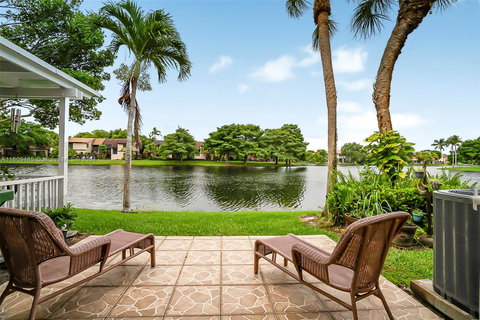 Beautiful 2 Bed, 2.5 Bath Home with Converted Garage in the heart of Pembroke Pines. Enjoy a relaxing evening on the expanded patio overlooking a tranquil wide lake. This nicely updated home features large ceramic tile floors cut on diagonal downstairs, plantation shutters, and crown molding, custom closet. The kitchen boasts stainless steel appliances, and both bedrooms upstairs have ensuite bathrooms. The converted garage makes a great office or playroom. Additional amenities include accordion shutters, exterior lighting, tankless water heater, newer A/C, Front load washer/dryer. Nice and quiet HOA with community pool and great schools. Close to great shops, fine dining, and other attractions. HOA will Replace Roof shortly includes building exterior, and may reduce insurance. Hurry!
