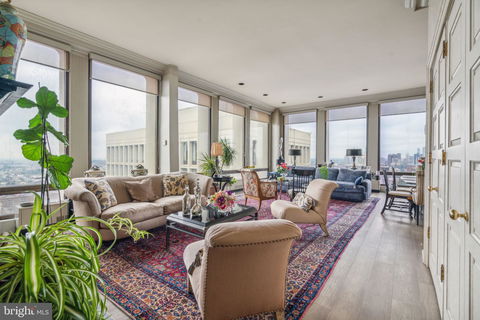 Custom designed penthouse offering unparalleled sunrise and sunset views of Center City and the Delaware River at Society Hill Towers. This stunning residence features three bedrooms, two and a half bathrooms, an office/den, beautiful detailwork, and high-quality updates throughout. Enter into the ornate foyer with large coat closet, wainscotting, black and white Italian marble tile floor, and conveniently located powder room. The foyer branches in two directions-- one leading to the primary bedroom and great room, and the other leading to the kitchen and additional bedrooms. A custom feature added to this layout is an open and closeable wall that allows the side leading to the kitchen to be blocked off. The great room boasts a beautiful fireplace with marble surround, two walls of floor-to-ceiling windows with see-forever city views, a wet bar concealed behind custom hand milled doors, and ample space for entertaining, living, and dining. Adjacent to the great room is the updated kitchen with custom cabinetry, granite countertops, decorative tile backsplash, breakfast bar, tile floor, and high-end stainless steel appliances including a Sub Zero refrigerator, Bosch dishwasher, and Viking oven, microwave, and range. Off of the kitchen is a laundry closet with stacked Whirlpool washer/dryer. The primary bedroom boasts more floor-to-ceiling windows overlooking the river, three wall closets, a hardwood floor, and an updated ensuite bathroom. This luxurious primary bathroom has a large modern vanity with quartz top, stall shower, jacuzzi tub, and marble tile floor. Off of the kitchen is a hallway leading to two additional bedrooms and an open office/den. Both bedrooms are generously sized and feature oversized windows with Center City skyline views. They enjoy use of a full hall bathroom with jacuzzi tub shower and checkerboard tile floor. Additional highlights include new hardwood floors in the living space and hallways, high ceilings, recessed lighting, crown and baseboard molding, and excellent closet space throughout. Residents of Society Hill Towers enjoy a 24-hour doorman and all utilities plus basic cable. Access to the building's outdoor seasonal pool, fitness room, storage lockers, and parking in the building's underground garage are available for an additional fee. Also, there is an on-site Philly Car Share, a coin operated laundry room in the basement, and a shopping plaza on site with a market, dry cleaner, beauty salon, and one of Philly's most acclaimed restaurants, Zahav.