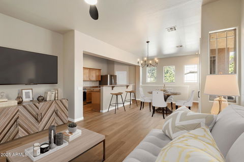 Stop scrolling—this is the turn-key home in a gated community you've been waiting for. The unit is situated directly over its own garage, meaning no neighbors below you for ultimate privacy. Enjoy brand-new flooring throughout, fresh designer paint, and new modern lighting/ceiling fans. The sleek kitchen features brand-new stainless steel appliances (fridge, range, dishwasher), new s/s sink and garbage disposal, with a huge walk-in pantry. Light and bright with tons of windows and high ceilings! Relax on your balcony or stroll over to the lush park with your dog or family and enjoy Papago view in the distance.This private community features a heated resort pool and spa. Easy highway access with a 2nd designated parking space that's ideal!