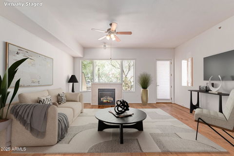 Urban living at its best! Freshly painted and new carpet! This home is turn key ready! In this 2 bedroom 2.5 bath you'll find stylish wood floors, a cozy fireplace, and a spacious living area that's perfect for lounging or entertaining. With stainless steel appliances, granite counters, and a breakfast bar ready for your morning coffee or late-night snacks. The primary bedroom is your personal retreat, featuring a private bath with double sinks, a relaxing garden tub, and a sleek glass-enclosed shower. A private balcony ideal for enjoying a sunset sip or your favorite brew. Plus, enjoy access to community amenities including a sparkling pool, soothing spa, fitness center, clubhouse and more! Just a short walk to The heard Museum and tons of fabulous restaurants! Don't miss out on this beauty! Welcome Home!