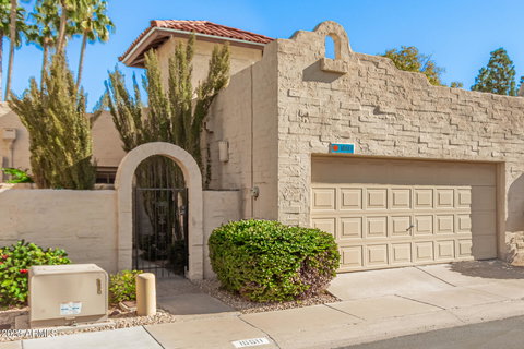 Beautiful 3 bedroom/2 bathroom townhome with numerous timeless, high-end upgrades in the highly sought-after gated community of Mission Square! Enter through charming courtyard to your mission style abode. The spacious living room welcomes you with its vaulted ceiling, clerestory windows, gas fireplace with travertine surround, defined dining area, and French doors leading to nicely landscaped patio perfect for entertaining, just steps from the community pool, spa, and ramada. The sunlit kitchen is a cook's dream with over 28 linear ft of butcher block counters, farmhouse sink, Kraftmaid cabinetry, stainless steel appliances, and charming Marvin double-paned casement windows. Spacious primary bedroom with walk-in cedar-lined closet. Both bathrooms feature subway tile, travertine tile floors, solid wood vanities, and high-end fixtures. Soothing and tasteful paint palette, hardwood flooring and solid mahogany doors throughout. Best location and biggest model within Mission Square - 1630 sf backing onto the central greenbelt. All on one level with attached 2-car garage.