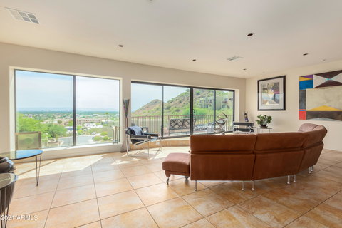 Prime Central Phoenix location! 2 Bed 2 Bath hillside condo w/ a private theater & a 2 car garage. 360 Degree Breath taking mountain & city light views. Gated Community w/ a beautiful community pool! Solar lease that is paid off. Open floorplan. Family room has a wall of glass that overlooks the city & mountains. Amazing views from every room! Kitchen is open to the family room w/ dark maple cabinets, granite counters, gas range, stainless steel appliances & a window overlooking the hillside w/ waterfall. Primary suite has a glass wall overlooking the valley & mountains & a huge custom walk-in closet. Primary bathroom is upgraded w/ a sep tub & shower, granite counters w/ dual glass vessel sinks. Secondary suite has a walk-in closet & bathroom. Theater has huge screen w/ stadium seating.