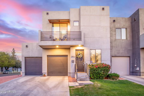 Don't hesitate to become the proud owner of this gorgeous corner lot residence in a peaceful 5-home community! Greet guests in the welcoming living room. Designer palette, wood-look tile floors & abundant natural light are some features you will love. Enjoy your favorite meals in the bright dining room w/backyard access. Elegant kitchen boasts ample cabinets w/crown molding, SS appliances, pantry, quartz counters and peninsula w/a breakfast bar. Upstairs, you'll find the spacious main retreat w/plush carpet, balcony access, impeccable ensuite w/dual sinks, quartz countertops, tub w/jets, & walk-in closet. Create fun memories in the lovely backyard w/paver patio,artificial turf & fire pit. Enjoy the private backyard access to the pool that is shared by only 4 other residences! See it today!