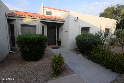 This lovely patio home is updated, sparkling clean and ready for you. The vaulted ceilings, natural light and a spacious living area inside and the private patio outside are perfect for quiet living or entertaining your friends. There is a BBQ center and room for dining outside, with even more room for seating. The kitchen has been remodeled with granite, stainless and an eat-in area. Great lighting and ceiling fans throughout, surround system in the den and a Murphy Bed in bedroom 2. Newer HVAC as well as a water treatment system and solar panels. Perfectly located near shopping, entertainment, highways and bus stop. Welcome home!