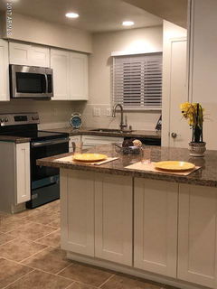 Granite kitchen, 3 bedrooms 2.5 baths, Enclosed patio, 2 car garage! A refreshing remodel in South Phoenix! Enjoy a NEW open kitchen with stainless appliances, subway backsplash, shaker white cabinets, oversized peninsula with breakfast bar. NEW tile flooring and NEW carpet. NEW energy efficient windows and light fixtures. Uber-useful private patio, nicely sized! Front courtyard is fully landscaped with palms and tiled walkway. Must See!