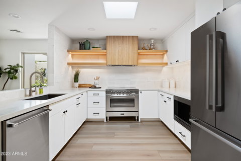 Rare opportunity in the historic Arcadia Sands community designed by ET Wright! Architectural interest on the exterior and completely renovated on the interior, by Arcadia Fortress, a local team who build multi million dollar new homes. As a result, you will receive an unprecedented level of quality and style at this price point. You must see this home IN PERSON to recognize the difference. This is not a flip, this is a true custom home and everything is designer grade. Open concept, all low ceiling areas removed, and lots of natural light! New AC unit, new roof coating, Gemcore floors, solid core doors, custom cabinets with dove tails and soft close, Vadara quartz counters, recessed LED can lights in all rooms, wide hallways, and custom closets in all bedrooms. Other designer touches include the white oak range hood and floating shelves with LEDs, full height Royal Satin marble walls, and the gorgeous bathrooms! Pro style appliance package with Verona range/dishwasher and Bosch refrigerator. Original wood burning fireplace was preserved! Breakfast nook and formal dining, split floor plan, and large primary suite with multiple closets. Private back yard with mature landscape and storage shed. This home is next to a grass area and near the pool. One of the best locations in the community! Only 40 homes and all are single story. Quick access to Sky Harbor, Downtown Phoenix, and Old Town Scottsdale. Walking distance to local shops and restaurants. Excellent lock n leave or primary residence. Check out the comps - this is the best quality (and value) home in 85018 under $1M!