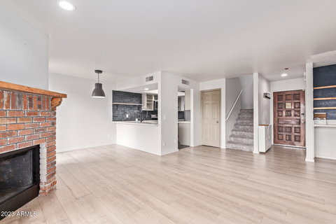 Updated apartment with views of Downtown Phoenix. Park 5th Avenue Condominiums located in the heart of the Melrose District, This apartment features and updated kitchen & Kitchen bar top eating area along with a cozy dining space to entertain. Large and open living area with a fireplace and opens up to outdoor balcony seating! Oversized, south facing, balcony offers a great space for private and outdoor entertaining! Upstairs there are two master bedrooms, each with their own private bathroom! There are two assigned parking spaces that are secured in an underground garage. Community pool
