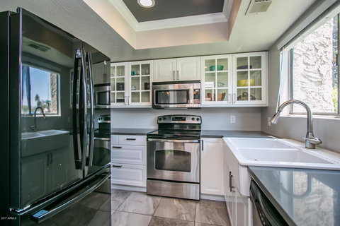 WOW! Fully remodeled, gorgeous single-story townhome-style unit WITH an attached 2 CAR GARAGE in the highly desirable Arcadia/85018 area! Beautifully remodeled with popular contemporary finishes and upgrades throughout. Striking remodeled kitchen with new white cabinets with glass inserts, quartz countertops, stainless steel appliances, and recessed can lighting. Spacious, open floorplan with large living space, split 2 bedrooms/2 baths, and vaulted ceilings throughout. Upgrades include: wood floors throughout, crown moulding throughout, updated lighting fixtures and ceilings fans, remodeled bathrooms, fireplace, and lots more! Large private enclosed patio with huge pergola and sitting/cooking areas. Hurry for this amazing opportunity in the Arcadia/85018 area under $300K!