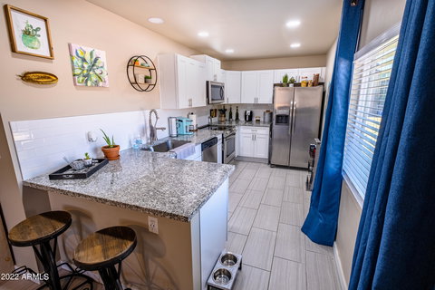 Fantastic Condo in a great location!! Minutes Away from Tempe, Downtown Phoenix, Sky Harbor Airport, Light Rail Line, Papago Park, Phoenix Zoo, Scottsdale, Desert Botanical Garden, Loop 101, Loop 202, 143 and 10 freeways. Completely remodeled in 2019/2020. Immaculate inside! Tiled flooring, Custom paint, White Shaker Cabinets with soft close & brushed pulls, Granite Countertops with a Breakfast bar, Stainless Appliances, Inside laundry (stacked w/d) and Ceiling fans in every room. Master Bedroom complemented by a spacious walk-in closet and private full bathroom. Full guest bath and spacious guest bedroom. Tank-less Water Heater. Gated Community.