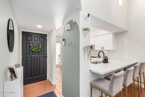 You don't want to miss this move-in ready, adorable townhome - ideally located just minutes from Old Town Scottsdale and Sky Harbor Airport! Inside, you'll be greeted by vaulted ceilings, tile and wood-look floors in all the right places, and a living room that showcases a cozy fireplace. The kitchen shines with stainless steel appliances, crisp white cabinetry, recessed lighting, sleek quartz counters, and a breakfast bar ready for your morning coffee rituals. The primary bedroom? It's a dream with a walk-in closet, and its own private bath. Top it all off with a cozy patio that's just waiting for sunset chats and your favorite drink in hand. Take advantage of the community pool on those warm summer days. Come see the magic yourself!