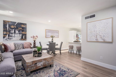 Freshly updated property centrally located in Uptown Phoenix. Luxurious high end finishes throughout including premium flooring, quartz countertops, tile, fixtures and paint. This home has a very rare in-unit washer/dryer hook up & dual pane windows. Gas is included in HOA fee. Property has a brand new roof as well. Enjoy this quiet end unit with a green grassy courtyard and pool just steps from the front door along with BBQ grills & outdoor dining in the courtyard. Enjoy your own oversize deck with beautiful mountain views and mature shade trees. A covered park space is also included. Exterior of community is receiving a fresh coat of paint. Walking distance to all the great Uptown Phoenix restaurants and shopping. Live in style in this budget friendly extensively remodeled masterpiece.