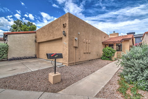 This adorable townhouse is all about location! Situated in north central Phoenix, this 2 bedroom, 2 bath townhouse also features a 2-car garage! Enjoy an open living area with vaulted ceilings, wet bar and a wood-burning fireplace. Lots of natural light comes through the large skylight in the kitchen and all-glass atrium. The kitchen features white cabinetry, a large breakfast bar, eat-in kitchen and a nicely sized dining area. The master bedroom has a spacious walk-in closet and ensuite bath with a dual sink vanity, separate tub and shower. Each bedroom has it's own private exit to the paved patio. Conveniently located close to the I-17, shopping and light rail!