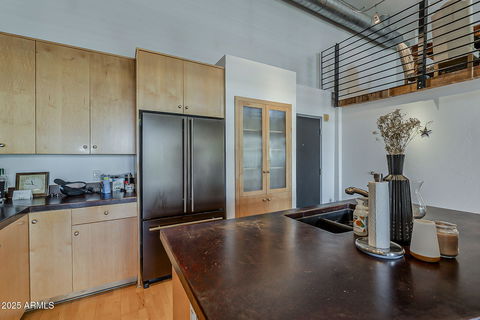 Experience city living with a one-of-a-kind perspective in this Artisan Lofts condo located in the heart of Downtown. The highlight? A private rooftop deck complete with a fireplace, built-in grill, and gorgeous mountain views perfect for quiet evenings or unforgettable gatherings under the Arizona sky. Inside, soaring ceilings and an open layout create a bright, airy feel. The kitchen blends style and function with stained concrete countertops and maple cabinetry, while the striking spiral staircase adds a modern, architectural touch. This gated community offers even more to enjoy, including a heated pool for year-round relaxation and the convenience of two dedicated garage parking spaces. With its blend of thoughtful design, unique features, and unbeatable views, this condo delivers!