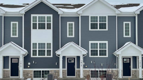 Envision yourself at 1415 Oakfield Lane in Pingree Grove, Illinois, a modern, new townhome in our scenic Cambridge Lakes North community. This townhome is MOVE-IN READY! Homesite includes a fully sodded yard that is maintained throughout the year as well as snow removal in the winter. This McKinley townhome is a captivating floor plan with over 1,500 square feet of living space which includes 2 bedrooms, loft, 2.5 baths and a finished flex space. As you step inside from the garage you'll be greeted by a finished flex space, perfect for an office or playroom. Walking up the stairs, you will find this home's open concept main level living space centered around a large kitchen island. The cozy kitchen overlooks both the front dining and back great room areas. Additionally, your kitchen features designer cabinetry, quartz countertops, stainless-steel appliances, and pantry. Arriving at the top floor, you'll find our bedrooms with a loft. Enjoy a spacious primary bedroom suite which includes a large walk-in closet lit up by its private bathroom with dual sinks and a walk-in shower. The rest of the upper level features a laundry room, secondary bedroom, loft with a full second bath and linen closet. You'll find luxury vinyl plank flooring throughout the main level kitchen and dining, bathrooms, and laundry. All Chicago homes include our America's Smart Home Technology. Exterior photo of actual home. Photos and model photos are of similar home. Actual home built may vary.