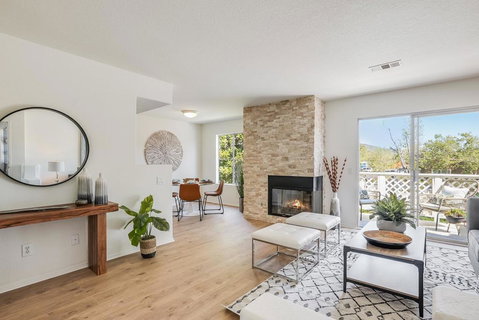 .........OPEN HOUSE...... SATURDAY... 4/23.... 11:00 - 3:00 ............... PRIME LOCATION OVERLOOKING POOL!... $35,000 remodel!!...Highly desirable LUXURY upper ONE LEVEL! Distant VIEWS. TWO CAR GARAGE just steps away. BRIGHT & SUNNY! Beautifully REMODELED! Located in the heart of “OLD POWAY” Farmer’s Market, Park, restaurants, shops, gym, coffee houses & historical ambiance! Excellent walkability! ALL NEW: Ledger stone fireplace, wood-like flooring, fresh paint, quartz counters & sinks, lifted ceiling & recessed lighting. ALL NEW refrigerator, dishwasher, stove and microwave. GORGEOUS TILE FLOORING in entry and bathrooms plus NEW TILED WALK-IN SHOWER, fixtures. Stacked washer/dryer, lockable screen door included. UPGRADED COMPOSITE DECK. Clubhouse, gym, TOT LOT and picnic area.
